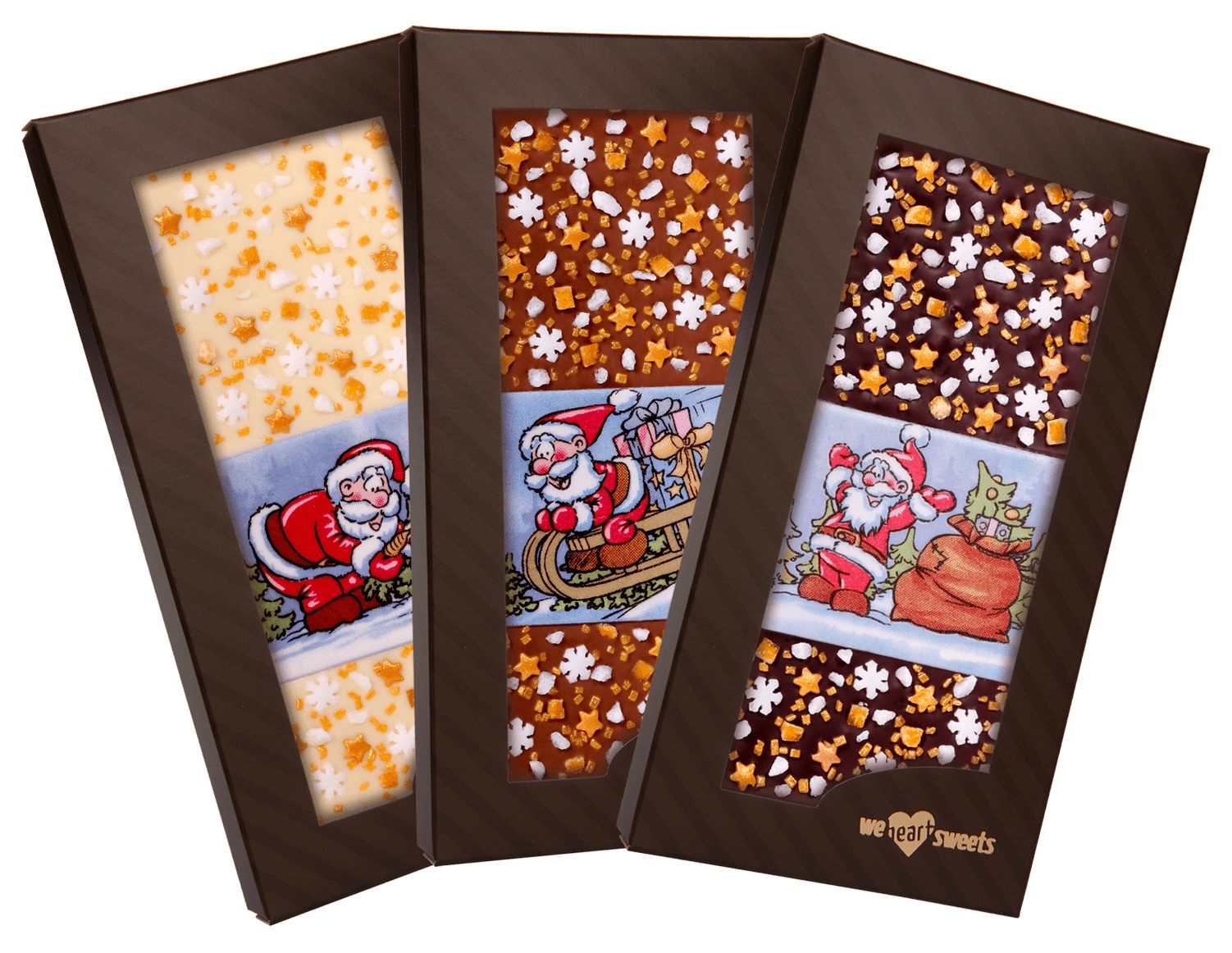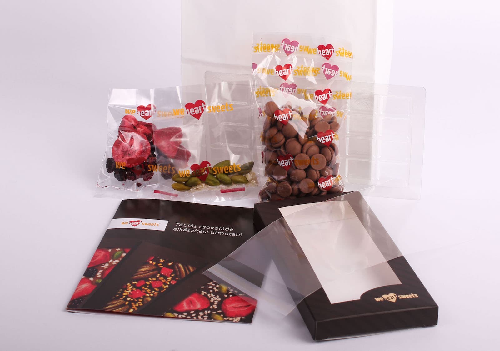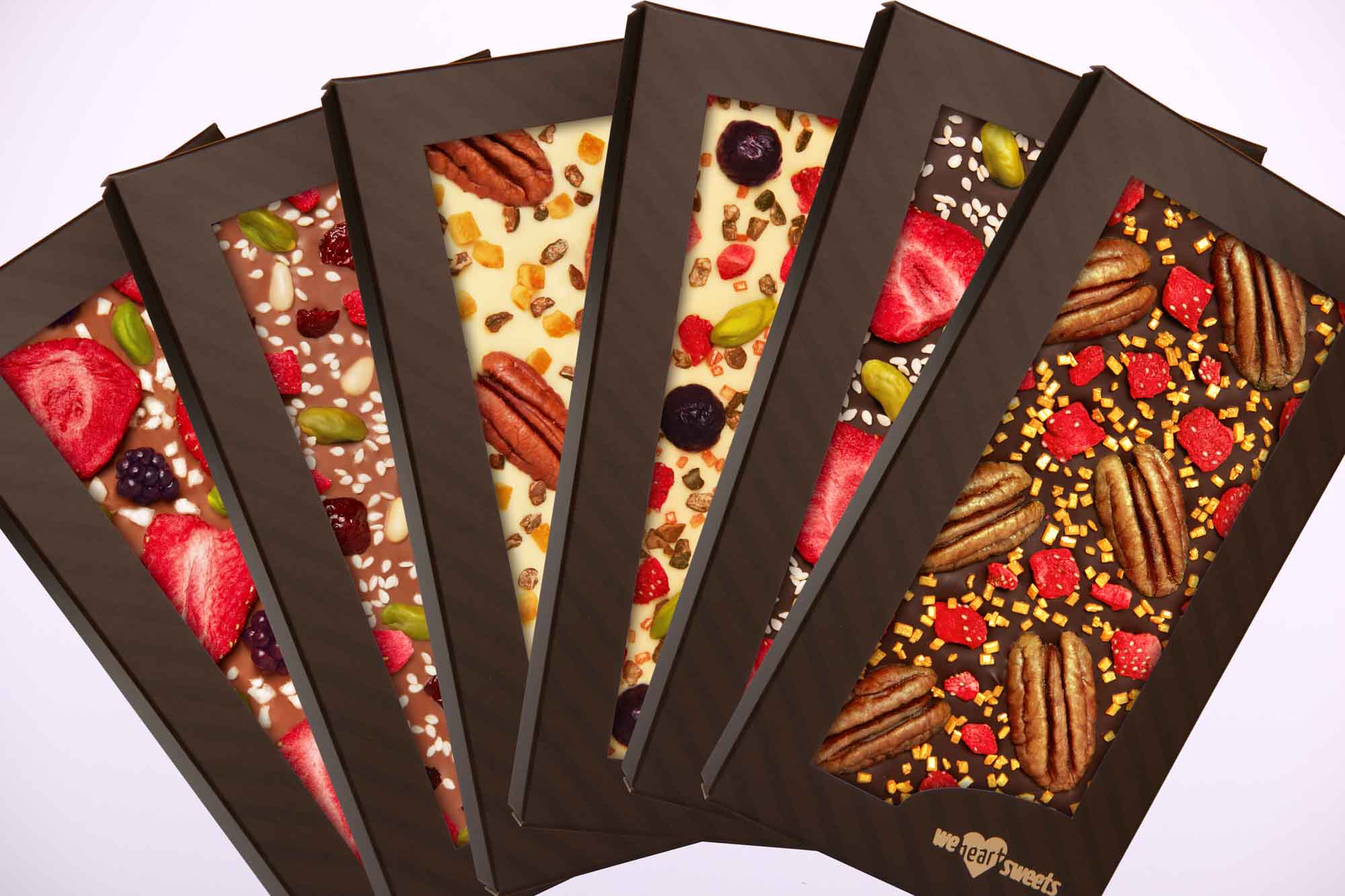 A WeHeartSweets termékei – amelyek közül az étcsokik 70,5%-os, a tejcsokoládék pedig 33,6%-os, ill. 28,1 %-os, magas kakaótartalmú, belga Callebaut csokoládéból készülnek – mindenki számára lehetővé teszik azt, hogy nemcsak egyedi és különleges, de ugyanakkor rendkívül finom édességeket készítsenek. A kiváló minőségű alapanyagból – a natúr madagaszkári tört kakaóbabból – készített a csokoládé  mellett a Szicília zöld aranyaként is emlegetett pisztácia, a liofilizált, kandírozott és aszalt gyümölcsök, valamint a sokféle, ötletes kiegészítő mind-mind rengeteg lehetőséget adnak nemcsak arra, hogy egyedi csokoládét készítsünk, hanem a kellemes időtöltésre is.